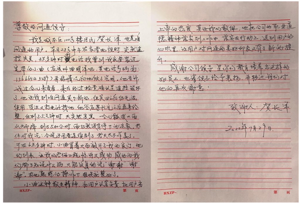 “晚上,小曲冒着大雨敲开了我的家门,他的到来,让我们老两口既惊讶又感动,感动得我们都不知说什么好…”。7月29日,一位七十多岁的老人步履蹒跚地走到烟台联通长岛分公司传达室,将一封手写感谢信亲自交到了工作人员的手中。