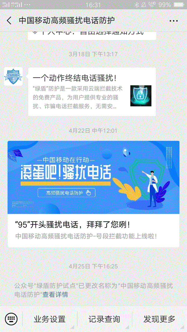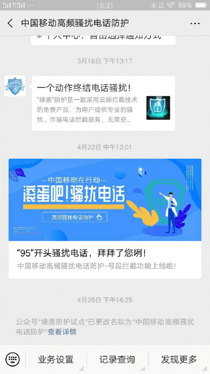 高频骚扰电话防护业务可以高效杜绝电话骚扰!发送“KTFSR”到10086开通/取消。关注公众号:“中国移动高频骚扰电话防护”,还能让操作更加透明!