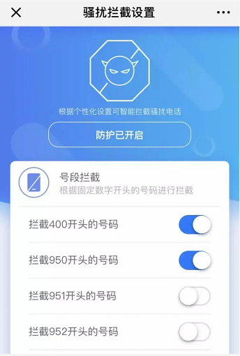 在高频骚扰电话拦截以外,还可以开启对骚扰电话高发的950/951/952/400开头的电话进行拦截。