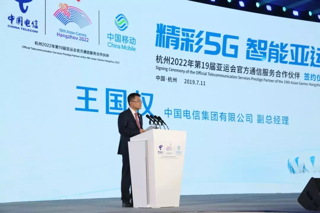 王国权表示,此次中国电信与中国移动联合成为杭州亚运会官方通信服务合作伙伴,双方强强联合,密切协同,各展所长,综合运用5G光宽双千兆、人工智能、云计算、大数据等信息化最新技术,为杭州亚运会精心架设通信基础设施、精心保障网络信息安全、精心提供智能应用服务。
