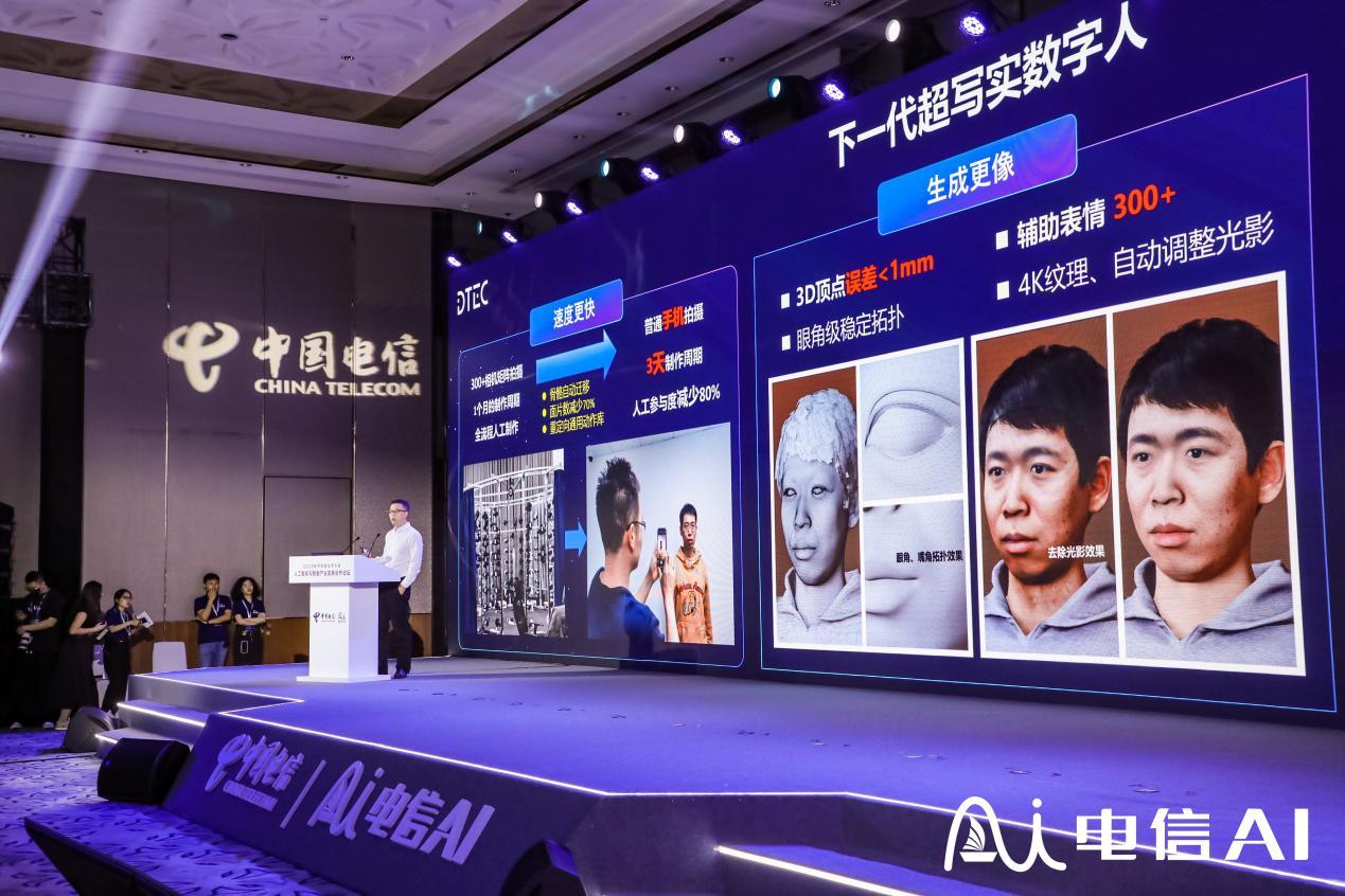 中国电信新一代3D数字人生成技术,实现了分钟级全自动3D重建及骨骼蒙皮的自适应迁移,3D顶点平均误差小于1mm,只需要几张照片就可以快速生成自己的超写实3D数字人,高度还原了面部形状、褶皱、五官形状、皮肤纹理等细节。在该技术下3D数字人制作时间可从1个月缩短至3天,人工参与步骤相比原来减少80%。同时自研了一套半自动拓扑绑定流程,可精细到眼角、嘴角级稳定拓扑,支持微表情级的动作表达。最终结合自研的驱动引擎和渲染引擎,让数字人在动作及情绪表达上有更多的可能性。
