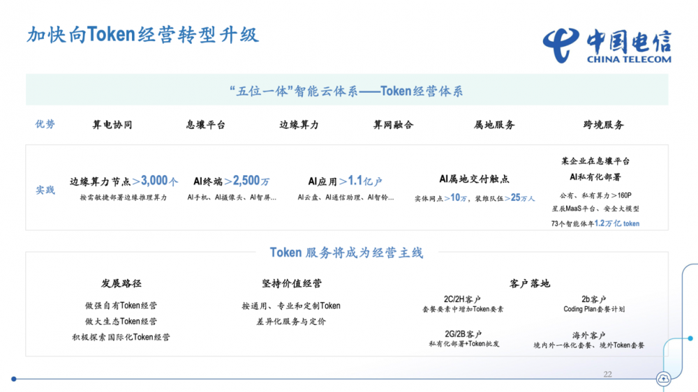 在随后的业绩说明会上,中国电信总经理刘桂清表示,在智能时代,打造智能经济新形态,必须加快从“流量经营”向“Token经营”的转型升级。中国电信提出五位一体智能云体系,就是Token经营体系。