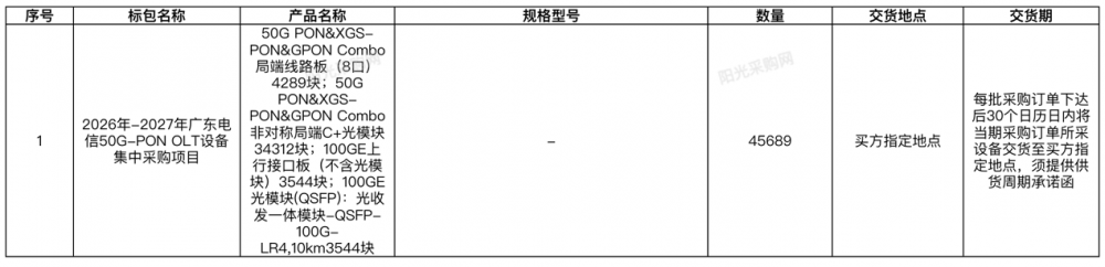 C114讯 4月3日消息(水易)来自中国电信阳光采购网消息,广东电信启动2026年-2027年50G-PON OLT设备集中采购项目。