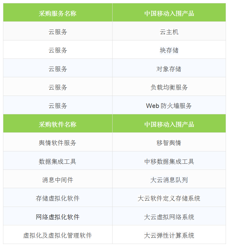 近日,中央国家机关2019年软件协议供货采购项目入围公告发布,中国移动云主机、块存储、对象存储、负载均衡、web防火墙全量云计算服务包,以及网络虚拟化、存储虚拟化、虚拟化及虚拟化管理、舆情等6款软件产品成功入围。