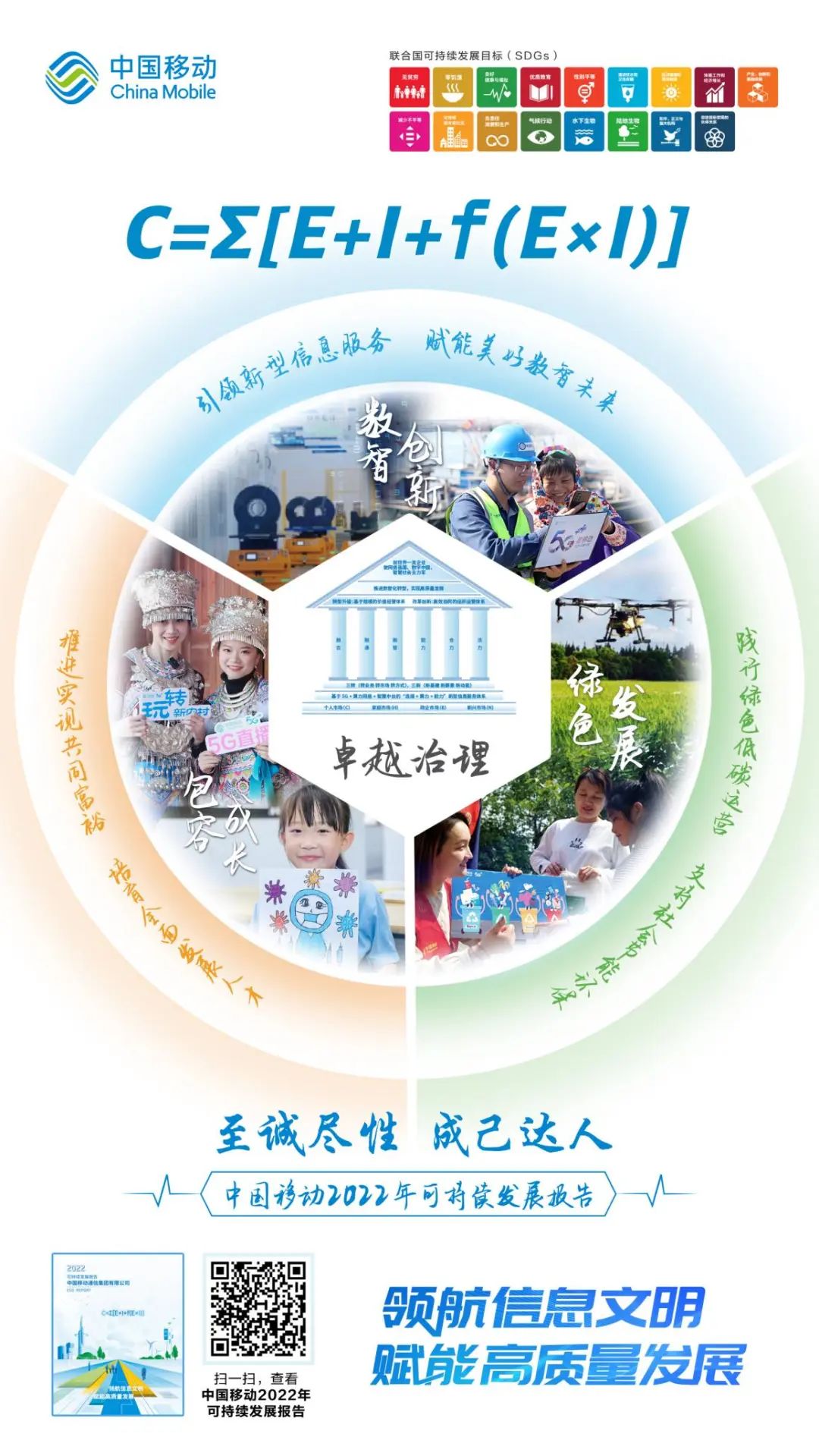 中国移动董事长杨杰在报告中表示,我们持续深入思考“如何实现社会和企业的可持续发展”这一重大命题,从大历史观、大战略观的高度,深刻洞察了能量和信息驱动人类文明进步的内在规律,并将其表达为:C=∑[E+I+f(E×I)]。基于对信息文明发展规律的认识,公司全力推进新基建、融合新要素、激发新动能,有效克服多重挑战,收入结构更加稳健,整体抗风险能力显著提升,企业对经济、社会、环境的价值贡献持续扩大。