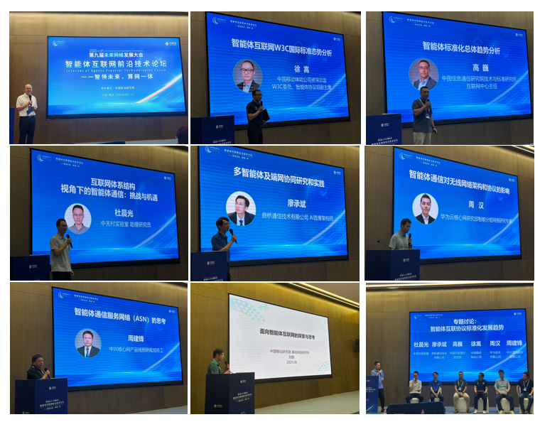 论坛期间,多位行业专家发表主旨演讲,分享前沿洞见。中国移动咪咕公司资深总监、W3C委员、智能体协议组副主席徐嵩,以《智能体互联网W3C国际标准态势分析》为题,分享了W3C组织智能体互联网的标准现状与未来趋势。中国信息通信研究院标准所互联网中心主任高巍发表题为《智能体标准化总体趋势分析》的演讲,介绍了智能体国内外标准化现状与挑战。中关村实验室助理研究员杜晨光发表题为《互联网体系结构视角下的智能体通信:挑战与机遇》的演讲,从互联网体系角度出发分享了智能体通信的发展现状与趋势。鼎桥通信技术有限公司 AI首席架构师廖承斌发表题为《多智能体及端网协同研究和实践》的演讲,介绍了具身智能对通信网络的新的要求。华为云核心网研究部智能分组网络研究专家周汉发表题为《智能体通信对无线网络架构和协议的影响》的演讲,探讨了智能体引入对于无线网络通信的需求和影响。中兴核心网产品线预研规划总工周建锋发表题为《智能体通信服务网络(ASN)的思考》的演讲,介绍了对于智能体通信服务网络的设计思考。中国移动研究院基础网络技术研究所技术经理刘鹏发表题为《面向智能体互联网的探索与思考》的演讲,探讨了中国移动对于智能体互联网的思考与实践。会议期间,中国移动研究院项目经理姚柯翰主持研讨环节,与各位专家聚焦智能体互联网技术创新和实践展开研讨。