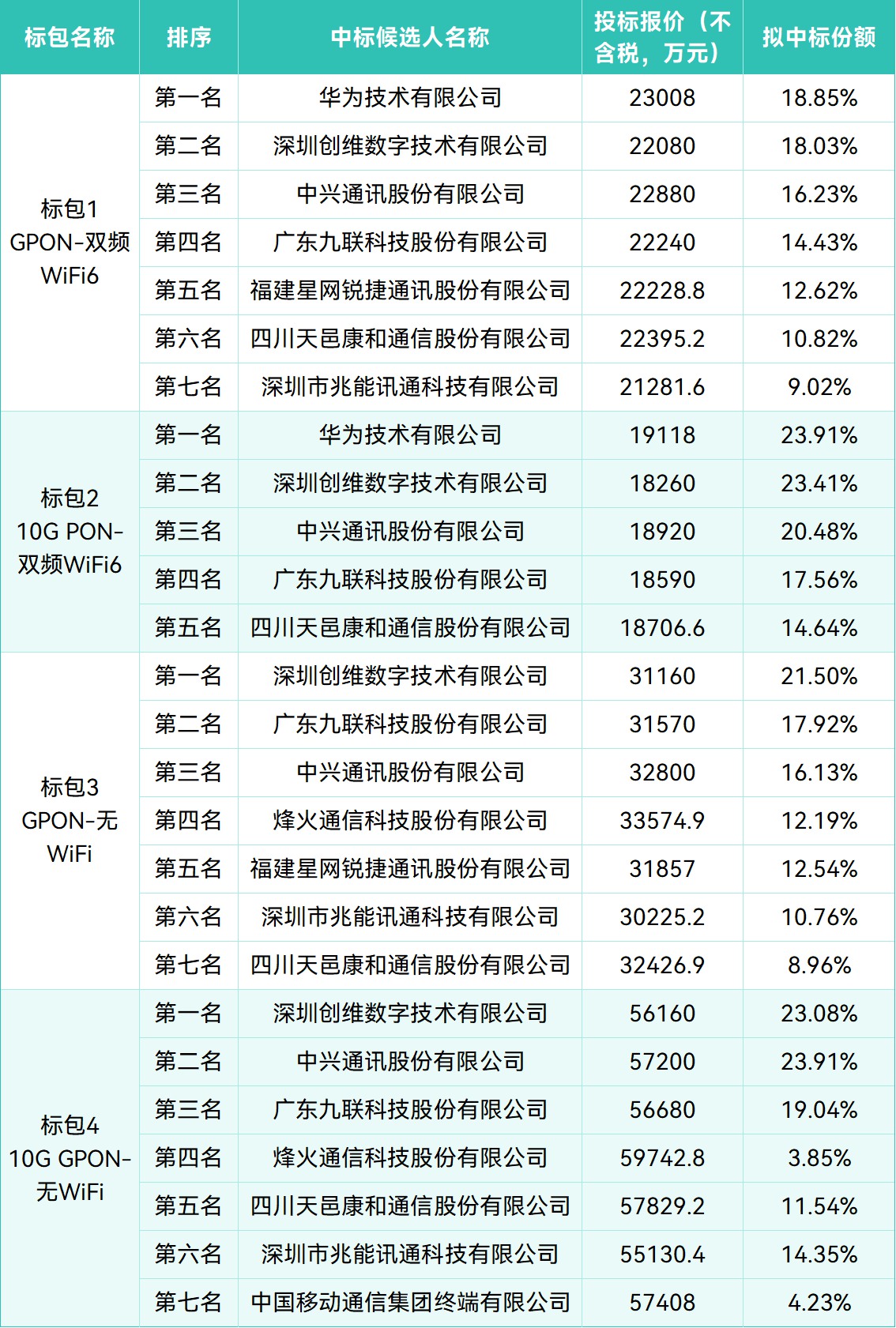 标包2(10G GPON-双频WiFi6)共5家中标候选人,华为再次居首,报价1.91亿元,份额23.91%;创维数字、中兴通讯紧随其后。