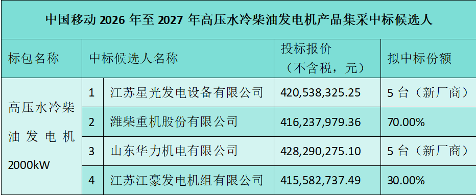 C114讯 4月2日消息(九九)中国移动采购与招标网日前发布2026年至2027年高压水冷柴油发电机产品集中采购项目中标候选人公示,潍柴重机等四家中标。