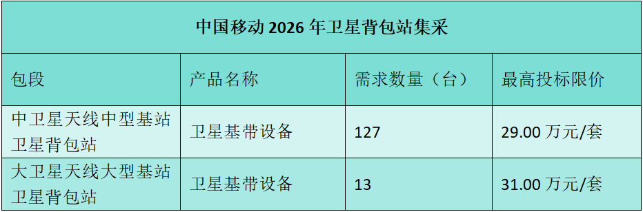 中国移动卫星背包站集采:规模为140套,限价4086万元