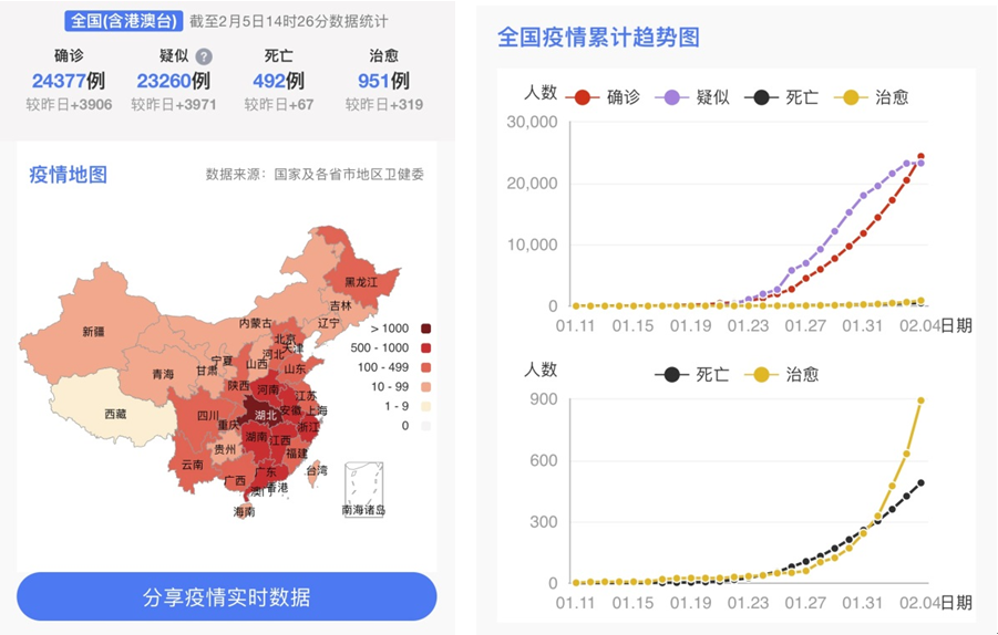 在疫情地图板块,用户可以速览全国及全世界范围内所有的新型冠状病毒疫情状况,实时掌握确诊、疑似、死亡及治愈的病例数据,还能清晰的看到全国疫情的变化趋势图。用户通过了解所在地和目的地的疫情状况,能够合理安排日程,更好规避风险。