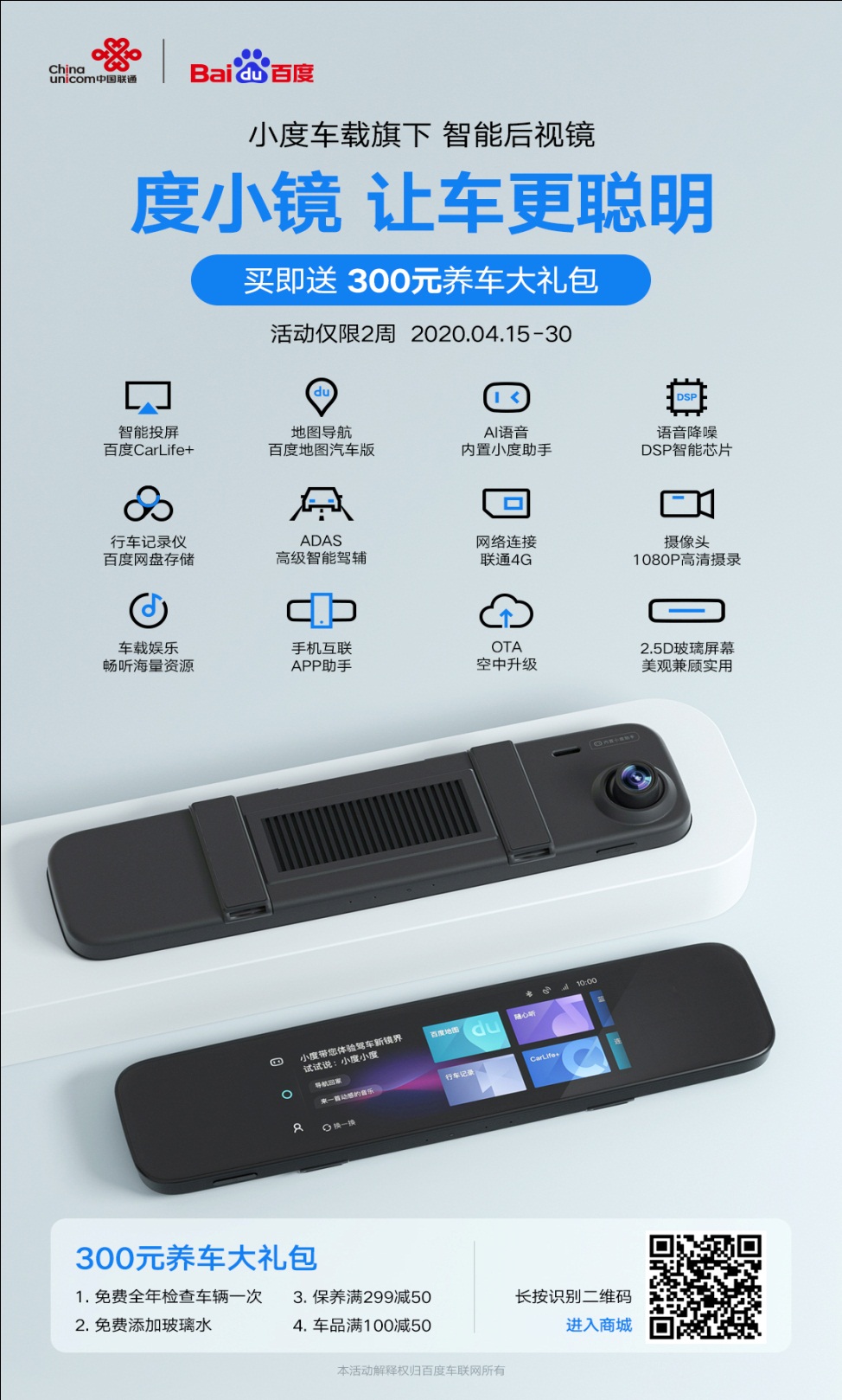 今日起,联通营业厅等渠道已正式发售“度小镜”,下单还享300元养车大礼包,识别下图二维码即可进入订购页面,开启智行时代。