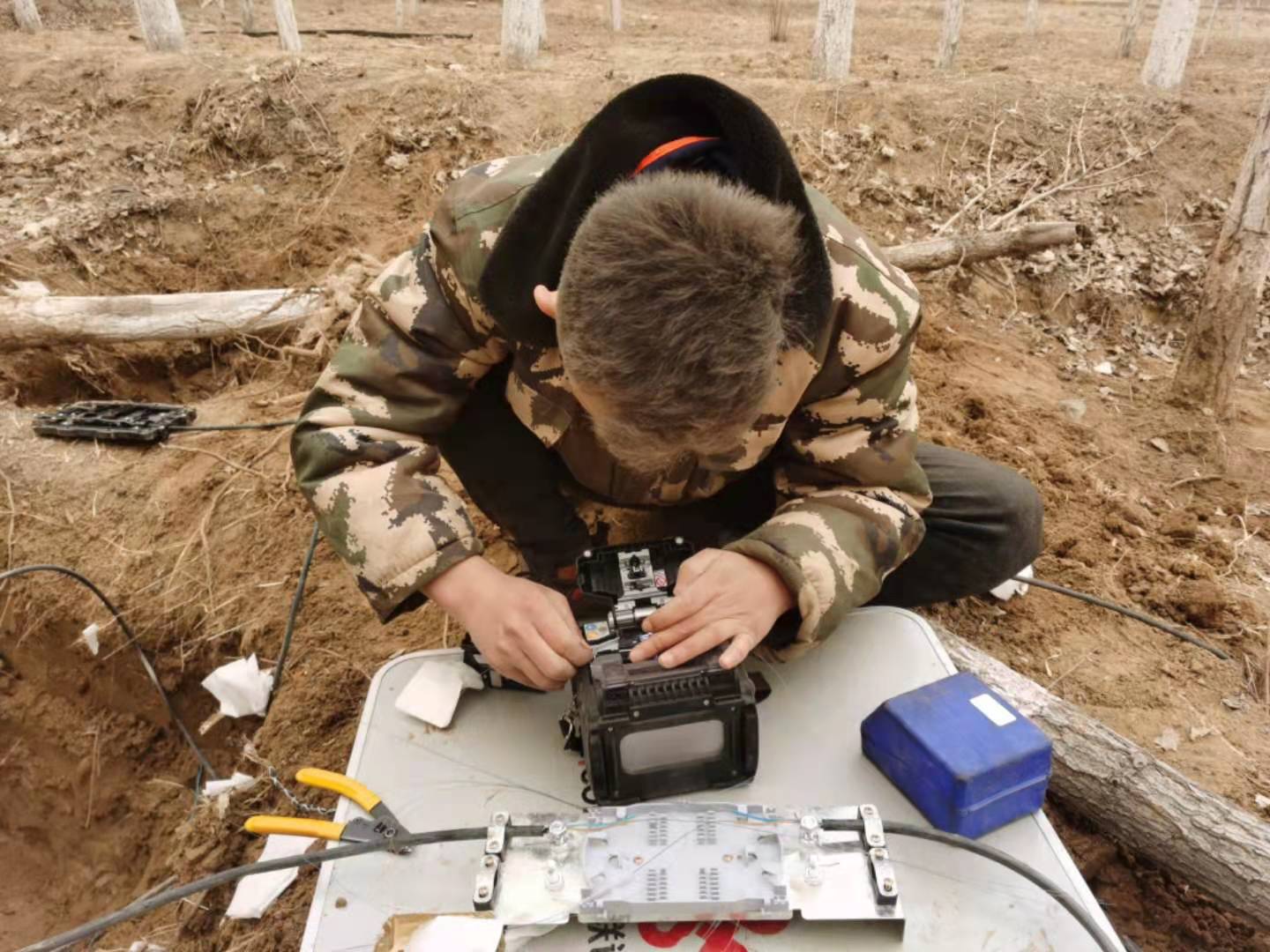 在宁夏,为抢修处理光缆中断现场,维护人员埋头苦干,沙尘落得满头都是。