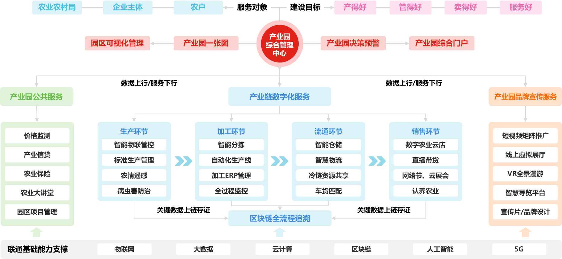 联通现代农业产业园以物联网、大数据、人工智能等数字技术为抓手,围绕“产得好、卖得好、管得好、服务好”的目标,建设产业园“1中心+3工程”,为农业农村局、产业园企业主体、产业园农户提供数字化、一体化、集约化的产业服务。目前,该模式仅在广东省就已服务现代农业产业园22个,服务对象涵盖种植、水产、畜牧等领域,被评选为“2020年世界数字农业大会十大创新案例”。