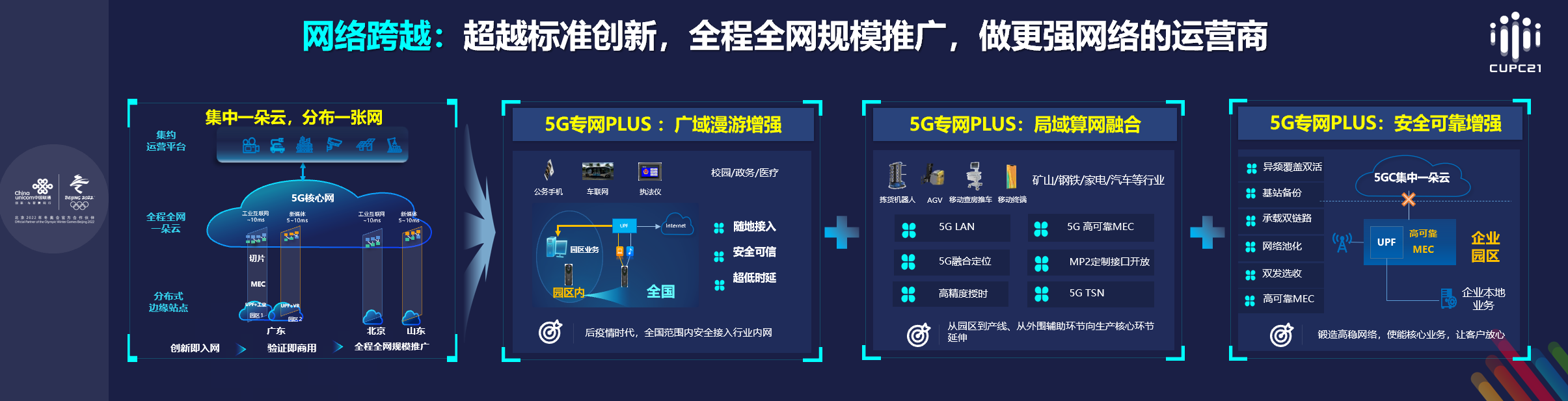 在网络跨越方面,中国联通打造了5G C集中一朵云、分布一张网的立体网络架构,快速实现创新即入网、验证即商用、全程全网规模化推广。