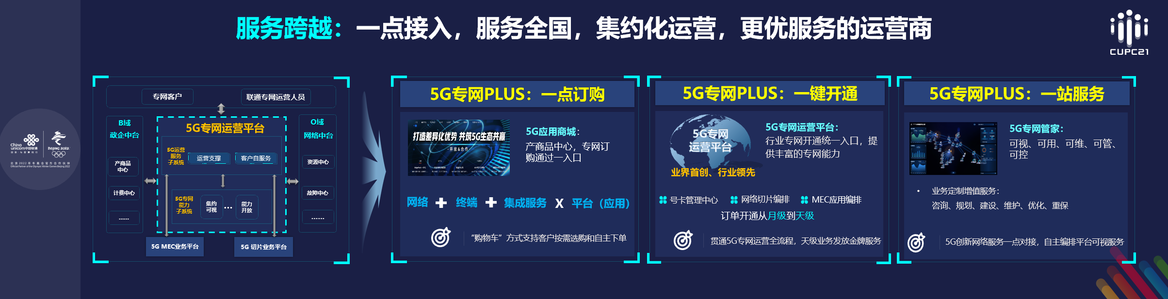 ——“联通5G专网PLUS”增强了专网产品的一键开通能力,依托5G专网运营平台,将产品订单自动流转到号卡、网络切片编排、MEC等业务子系统,在行业内率先贯通5G专网运营全流程,提供天级业务发放的金牌服务。