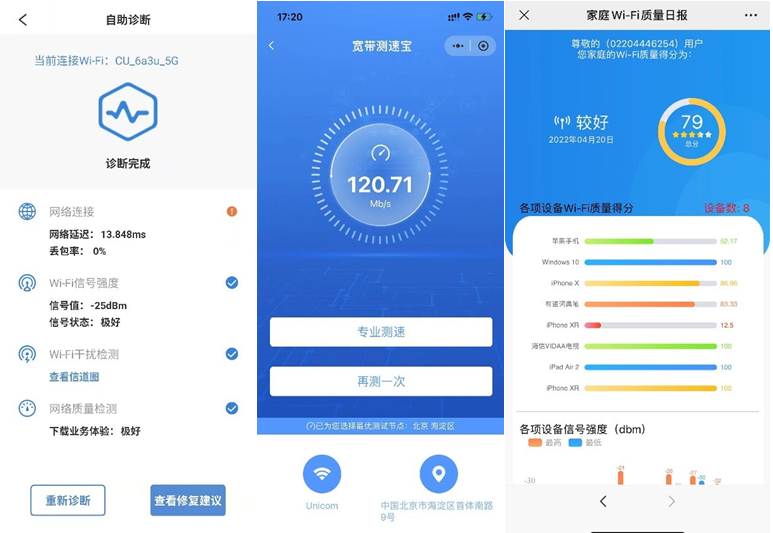 除此之外,平台向用户提供了家庭Wi-Fi质量日报,能够分析路由器下挂的每一个使用终端和信号强度,并给出综合评分,让用户家中用网、心中有数。