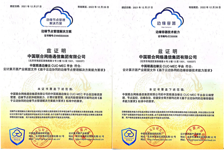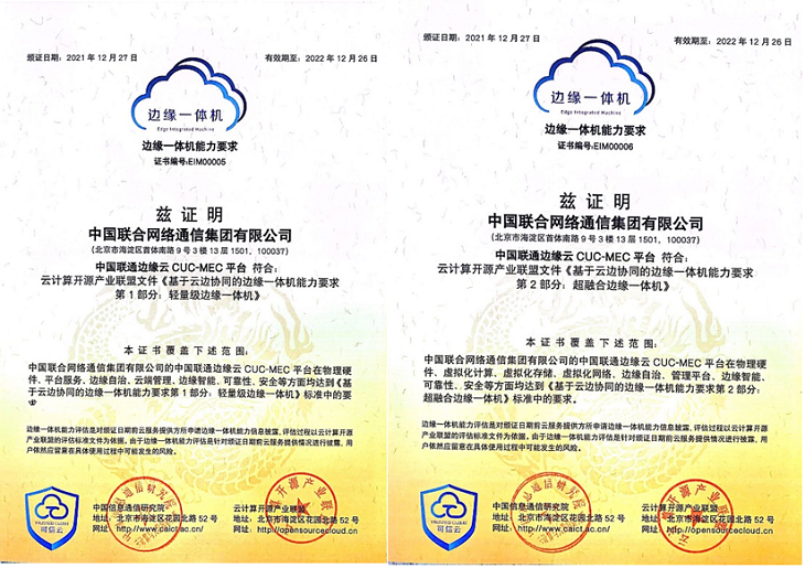 据了解,中国联通5G 边缘计算平台首批通过“边缘一体机(轻量级)”、“边缘一体机(超融合)”、“边缘节点管理解决方案”、“边缘容器”四项权威专业能力认证。