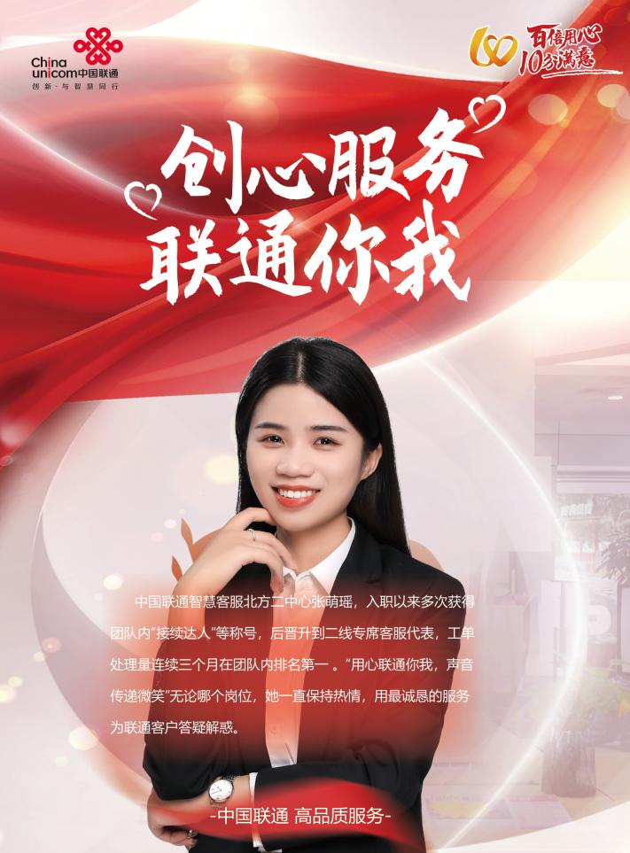 中国联通智慧客服北方二中心客服代表张萌瑶,自加入联通客服三年以来,始终坚持“诚信、细致、优质”的服务理念,将“创新服务、联通你我”作为自己工作准则,在岗位上一丝不苟用自己的行动诠释00后的青春活力,彰显年轻一代客服人的担当。
