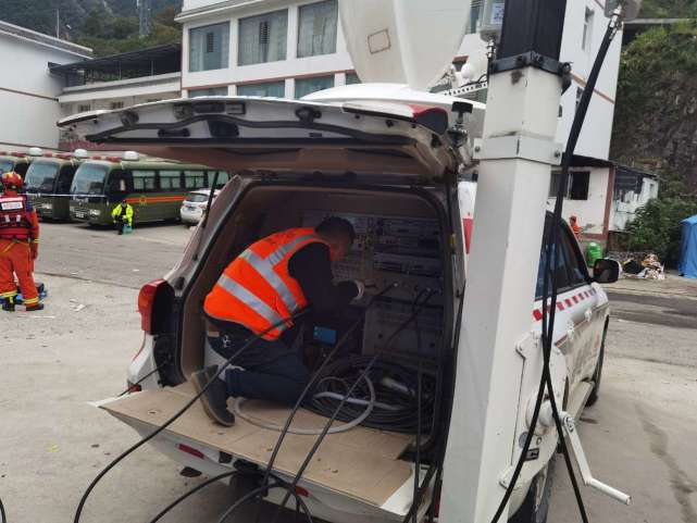 因道路受阻,联通卫星通信基站车在距离磨西镇不到2公里的外围紧急开通4G基站,保障现场抢险队伍通信。