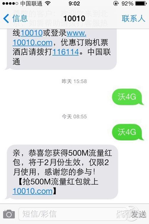 向联通10010发送"沃4G"即可申请领取,500MB的流量红包将作为2月份流量叠加包使用。笔者亲测可用。