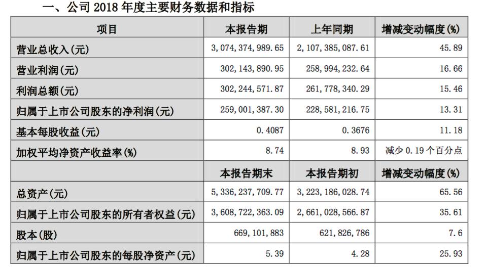 截至2018年末,总资产53.36亿元,同比增幅65.56%;公司归属于上市公司股东的所有者权益36.09亿元,较年初增长35.61%;归属于上市公司股东的每股净资产5.39元,较年初增长25.93%。