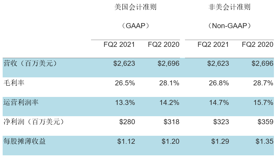 公司尚未将2021财年第三季度的非美会计准则(Non-GAAP)每股摊薄收益与最直接关联的美国会计准则(GAAP)相关指标进行对比,因为可能影响这些指标的重大事项不在我们的可控范围内和/或无法合理预测,这些项目包括但不限于加速折旧、资产减值、以及节约成本带来的费用、部门重组费用、战略投资损失或带来的减值、这些项目造成的所得税调整、以及其他可能产生的费用和收益。这些项目的数量目前暂时未知,但是可能对未来的财务结果产生巨大影响。很难将2021财年第三季度的非美会计准则(Non-GAAP)每股摊薄收益与美国会计准则(GAAP)相关数据进行对比。以上新闻稿中包含了我们已经实现的非美会计准则(Non-GAAP)与最相关的美国会计准则(GAAP)有关指标的对比。