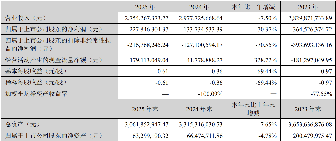C114讯 4月23日消息(颜翊)昨日,日海智能发布了2025年年度报告。报告期内,公司实现营业收入27.54亿元,较上年同期下降7.5%;归属于母公司所有者的净利润亏损2.28亿元,同比增亏70.37%。