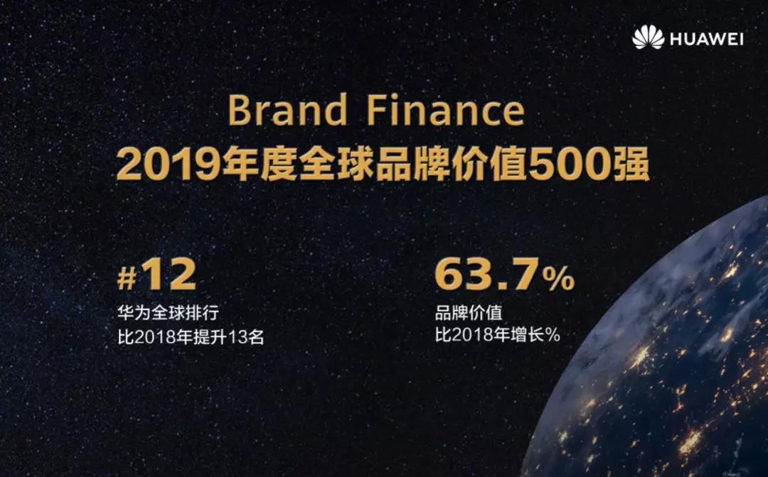 近日,英国权威品牌价值咨询公司Brand Finance发布了“2019年度全球品牌价值500强”的报告,华为排名再次大幅提升,凭借622.78亿美元的品牌价值从2018年的25位提升至12位,品牌价值也较去年增加63.7%,成为增幅最快品牌之一。