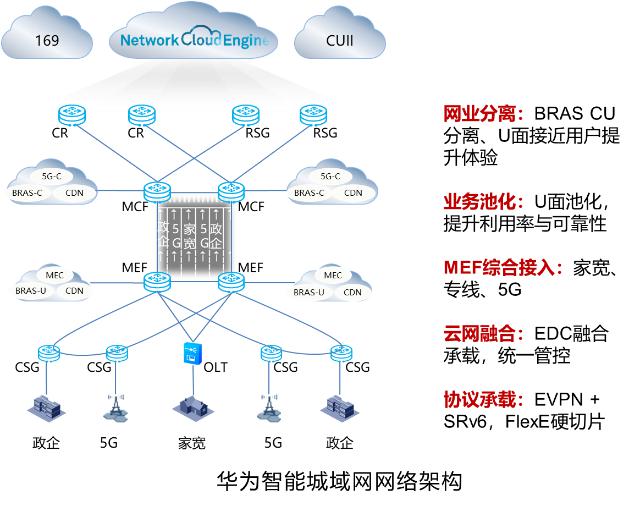 管控上,引入了集管理、控制、分析一体化的iMaster NCE(Network Cloud Engine,网络云化引擎),使能网络自动化业务发放、智能化全局控制和智能故障分析的能力,建立起智能城域网的智慧大脑。