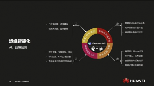 同时,CampusInsight通过大数据和AI算法对采集数据智能分析,可以有效识别网络运维中的四大类典型故障,进行根因分析并提供修复建议。除了群障分析,还能提供更为精细化的个障分析。通过这样的主动运维,有效减少了园区在网用户的投诉,降低了网络OPEX。