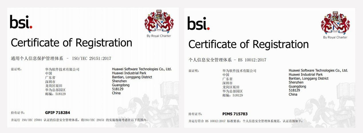 继上月获得全球首批ISO/IEC27701认证后,华为云于近日又获得了ISO/IEC 29151、BS 10012两项国际安全认证。这表明华为云在保护用户数据隐私上再次走在世界前列,能为全球用户提供安全可信的云服务。加上已获得的ISO 27018认证,至此,华为云获得了所有关于隐私保护的权威认证。
