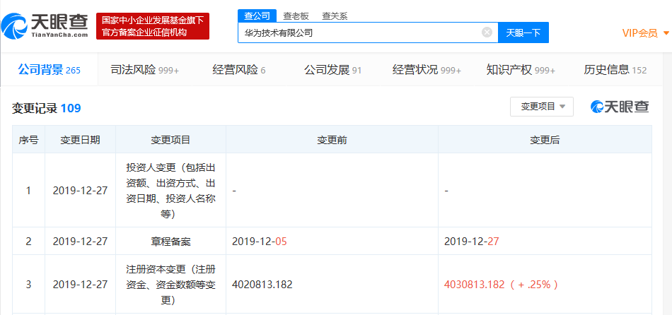 天眼查数据显示,2019年12月27日,华为技术有限公司注册资本新增,由原来的约402.1亿人民币新增至现在的约403.1亿人民币。