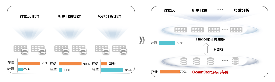 采用华为大数据存算分离方案,计算集群和存储集群可以分别云化,实现资源的按需调度。既解决了不同大数据集群间计算、存储资源利用率不均的问题,又使得大数据计算节点可以和用户的其他计算节点能够按业务峰谷灵活调配,一举两得。