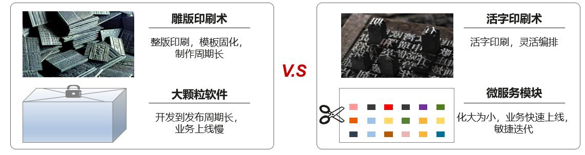 我们把传统的电信软件比作雕版印刷,单个汉字错误则导致整版废弃,耗时费力;微服务则完全颠覆了传统软件架构,就像活字印刷一样,个体错误不会导致整版返工,效率呈指数级提升。言而总之,将大颗粒的软件包分解成相互独立的小软件模块,以微服务的方式进行版本的开发,测试和发布,每个微服务有自己独立的版本号,升级时自动判断源版本和目标版本中每个微服务的版本号,只升级有变化的微服务,这样即可实现小快灵的增量软件发布。