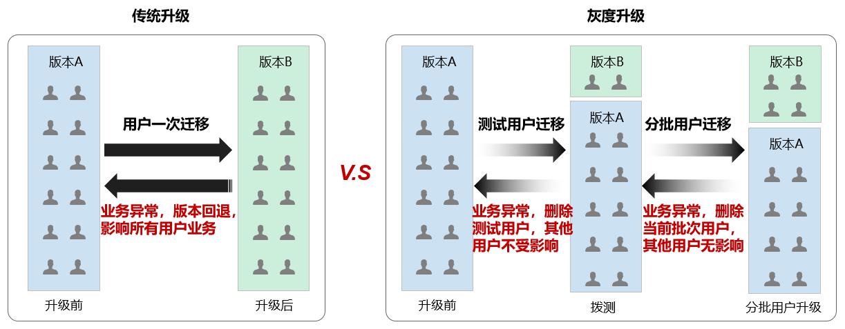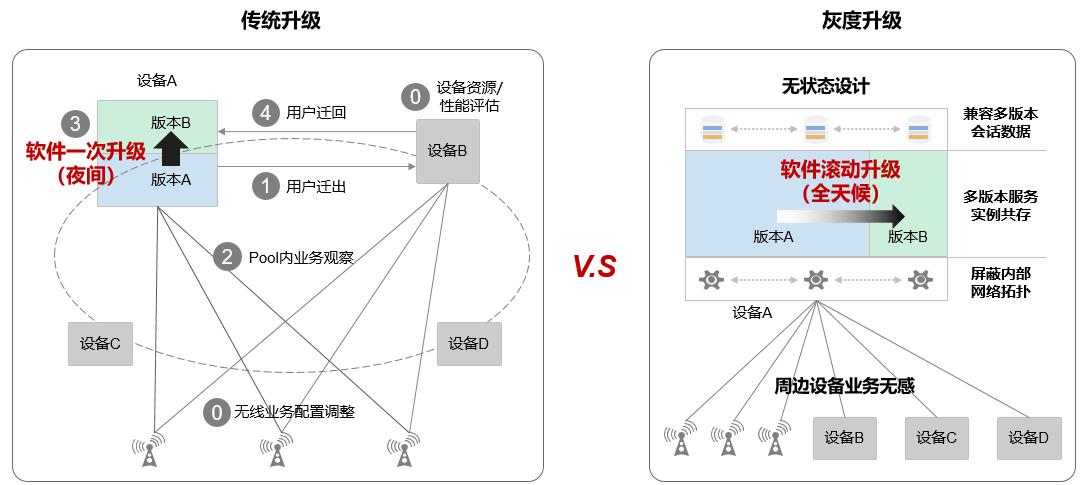 传统电信软件的版本发布上线是排他性的,同一时间只能存在一个软件版本,而且升级过程要想做到业务无损,首先要做的就是花费大量时间将待升级设备上的用户迁移到Pool内其他设备上,需要评估这些在网设备的软硬件资源,业务模型等,同时针对周边无线,数通等设备进行相关的配置联动修改,牵一发动全身。如果无法采用Pool方式迁移用户,采用直接升级方式,必须在夜间进行操作,会导致业务中断30分钟以上,无法实现业务无损。灰度升级则打破了非黑即白的软件版本发布规则,基于软件三层解耦及无状态设计原则,实现多个版本会话的数据兼容,多版本服务或微服务实例共存,并通过负载均衡的智能业务分发能力实现外部网络设备无感知。系统内可同时存在两个软件版本,通过逐步滚动升级的方式,迁移至最终目标版本,无需提前准备用户迁移设备,无需关联修改无线,数通等设备,实现不分时段的全天候升级操作,业务“0”中断。