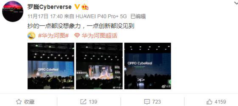 对于OPPO CybeReal,华为 Fellow Cyberverse总工程师、Camera总工程师罗巍给出了这样的评价,如图所示: