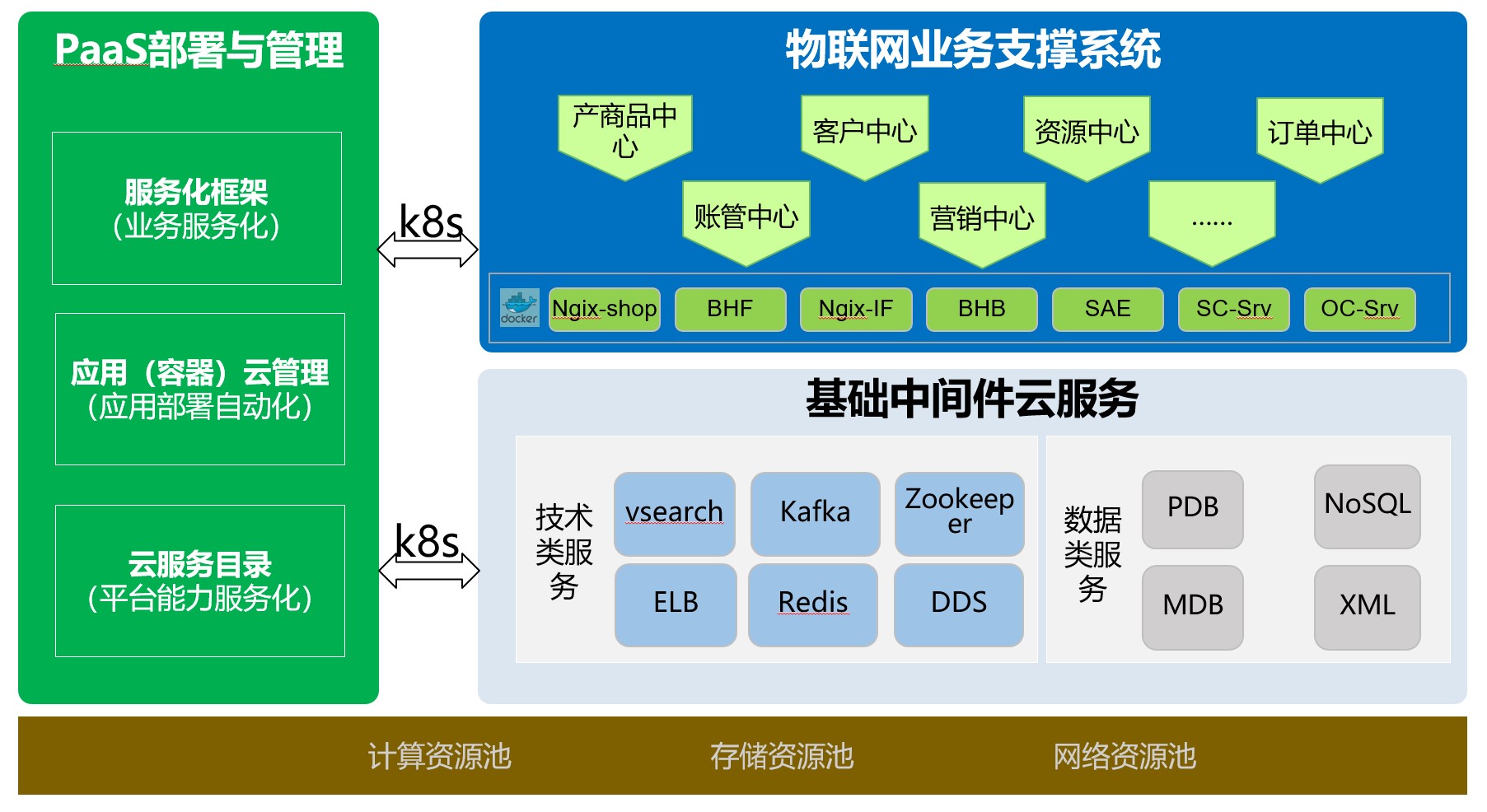 物联网支撑系统与磐基PaaS容器云平台对接,通过应用系统容器化改造,实现云化部署和业务应用与平台解耦。业务系统采用微服务化的设计理念,提供分布式服务框架+分布式数据服务框架,实现业务逻辑、数据和资源的解耦;业务应用支持线性扩展,结合容器提供的标准化的打包、封装、搬运机制,有效地简化了开发版本管理。PaaS作为基础技术平台向应用提供服务化的支撑能力,以服务化的形式提供弹性可扩展的基础技术平台,适配底层各类基础设施IaaS环境,应用与平台的深度融合,将支撑系统打造为一个完全适配敏捷开发和智能化运营的平台。