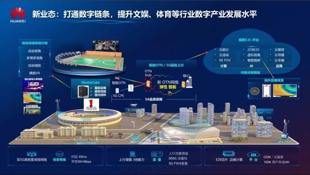 双5G网络的高密部署,为打通优质视频内容与广大的线上用户的连接提供了信息传送的高速通道;以MediaCube为代表的高新视频近源生产系统协同远端视频3.0+平台及视频云服务相关能力,产生出自由视角、8K VR、多视角等创新交互体验场景,为优质视频内容的创作及展现提供了更广阔的空间;云管边的协同,使得现场的观众能够感受到VIP最佳视角的观看体验,也让线上的观众能够获得更实时、更真实、更沉浸的的临场感。