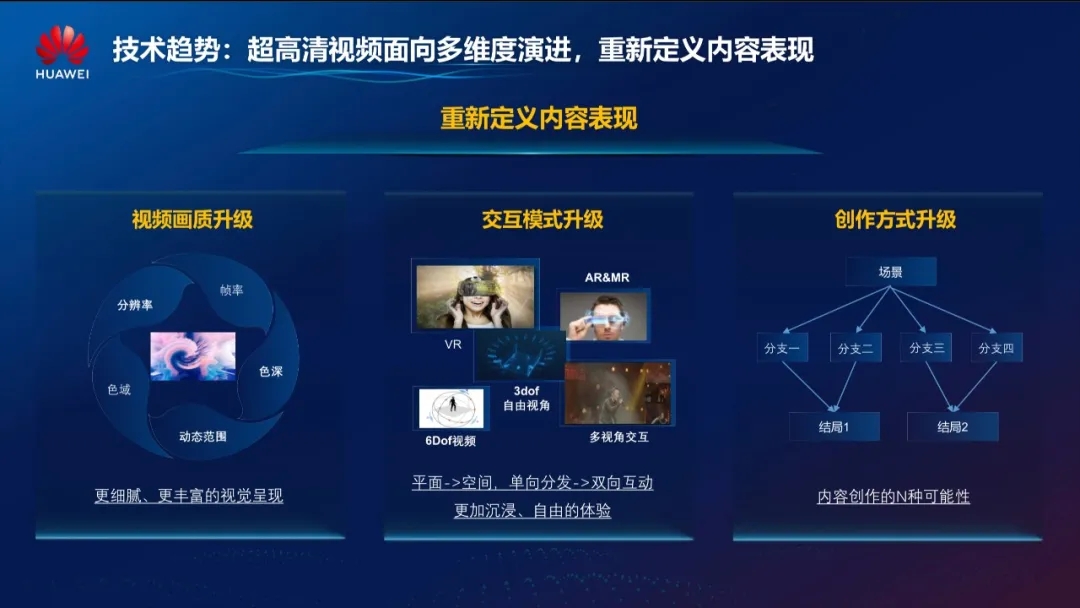 从发展趋势看,高新视频自身正在面临着视频画质、创作方式、交互模式三个维度的升级,这三个维度重新定义了视频内容表现。