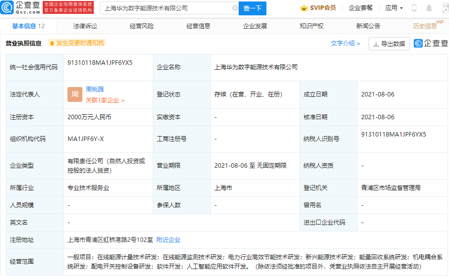 企查查 App 显示,8 月 6 日,上海华为数字能源技术有限公司成立,法定代表人为周桃园,注册资本 2000 万元人民币,经营范围包含:在线能源计量技术研发;在线能源监测技术研发;电力行业高效节能技术研发;新兴能源技术研发;能量回收系统研发等。