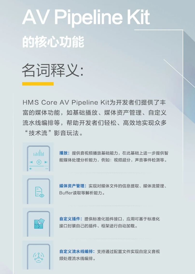 据华为介绍,AV Pipeline Kit 即多媒体管线服务,是一个端侧的音视频开发框架及插件体系,提供多媒体开发框架以及跨平台、高性能的多媒体处理能力,支持通过自定义插件和自定义流水线编排来实现业务场景拓展,降低影音、社交、电商等多媒体业务的开发难度,让应用更加聚焦于业务竞争力。
