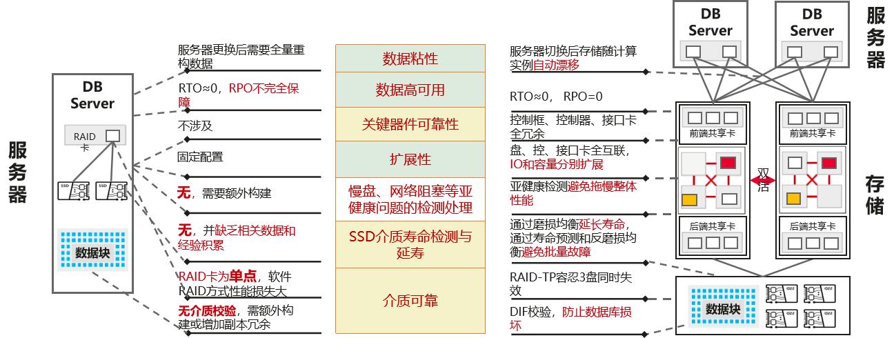 高可靠:利用华为OceanStor Dorado全闪存存储的分布式AA负载均衡架构、RAID2.0持久化技术、亚健康管理、SSD磨损均衡/反磨损均衡等能力,不但满足了数据库数据持久化能力下沉到存储对可靠性的严苛要求,还补齐了数据库快速数据重构、亚健康故障处理、SSD介质延寿和故障主动处理等能力,使数据库综合可靠性能能力有了大幅度提升;