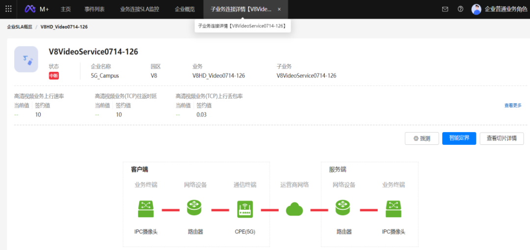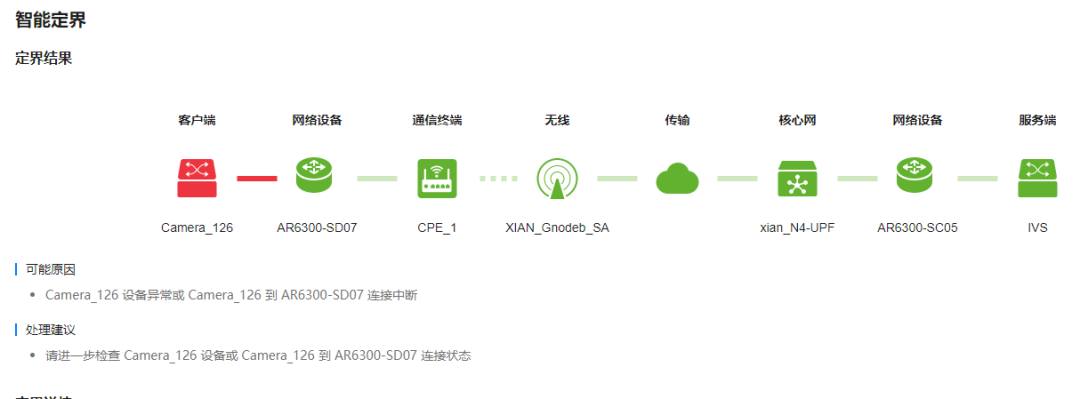 基于融合的数据源、丰富的故障规则库及强大的AI辅助定界能力,M+支持一键式智能快速定界,可迅速实现故障诊断,并提供处理建议。目前已支持120+ 故障规则,采集700+性能指标,识别800+故障告警和100+事件,覆盖业务中断/质差事件(如视频/PLC业务中断、卡顿)等20+典型故障场景。此外,依托强大的终端生态,基于已支持的100+智联终端,M+提供模拟拨测能力,可随时随地进行业务模拟,测试连接质量,支持端到端分段定界及故障排查,实现秒级故障发现,故障定界从0.5~30天缩短至5分钟以内,极大提升故障诊断效率及故障定界准确率。