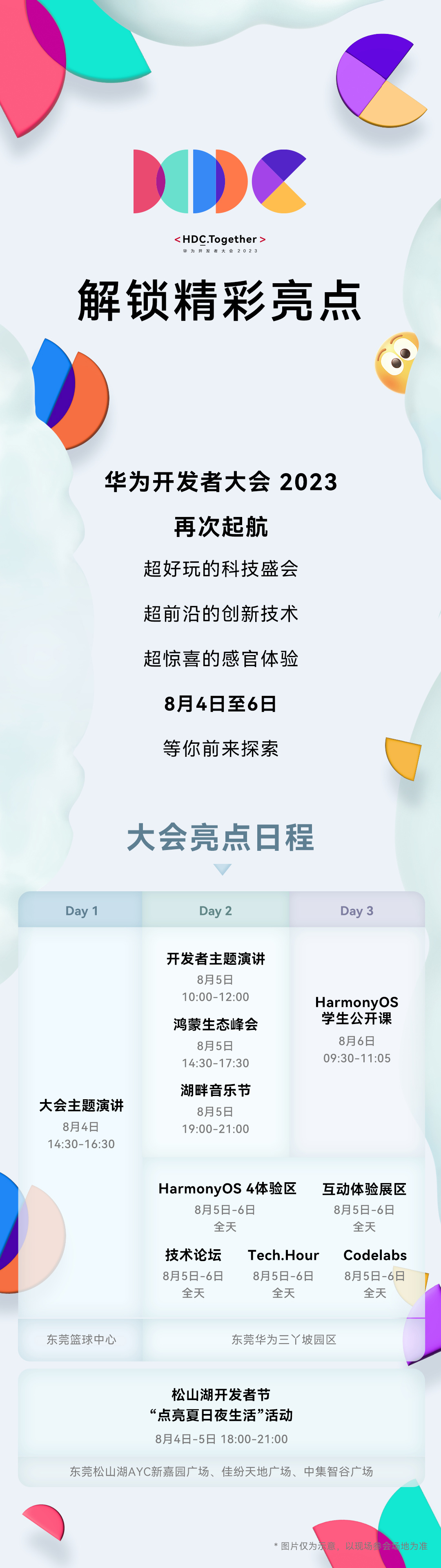 华为今日公布了 HDC.Together开发者大会 2023 的详细日程。整场大会将于 8 月 4 日-6 日之间举行,届时将发布最新一代鸿蒙HarmonyOS4 操作系统,随后开放公众体验。同时,还将有生态峰会、音乐节、学生公开课等多项活动。附详细日程如下: