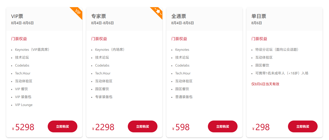 目前,HDC 2023 开发者大会提供四种形式门票,分别为 VIP 票(5298 元)、专家票(2298 元)、全通票(598 元)和单日票(298 元)。