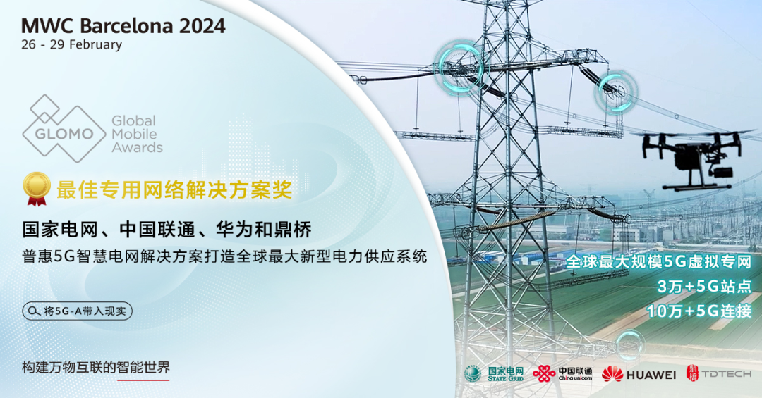 由国家电网、中国联通、华为和鼎桥四方联合打造的普惠5G智慧电网解决方案荣获GSMA GLOMO“最佳专用网络解决方案奖”(Best Private Network Solution),标志着5G智慧电网已步入大规模部署阶段,5G+电力融合创新成果得到了全球产业的高度认可。