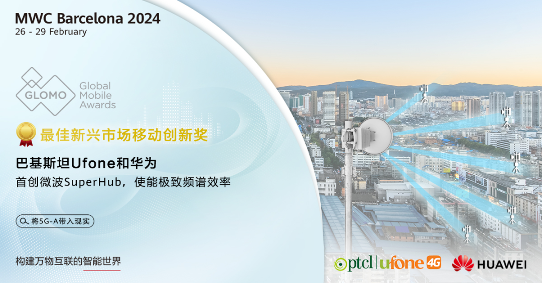 华为与巴基斯坦Ufone联合部署的全球首个SuperHub频谱效率提升方案荣获GSMA全球移动大奖(GLOMO奖)“最佳新兴市场移动创新奖”(Best Mobile Innovation for Emerging Markets),代表着华为在提高微波频谱效率、解决区域中心Hub站点相邻链路同频干扰问题上的持续创新获得了业界的高度认可,表彰了华为和Ufone通过联合创新与技术合作,使得相同频点可在15°~90°之间复用,频谱效率提升3倍,链路容量大幅提升,为全球带来更优的网络全联接所做出的卓越贡献。