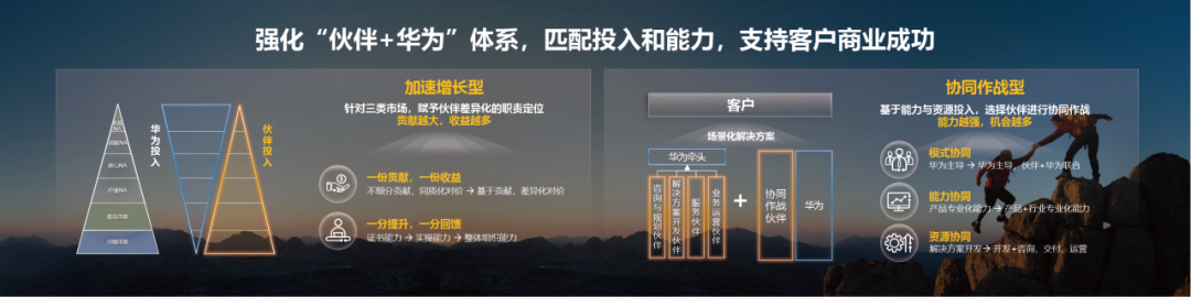 模式协同:从以华为主导的作战模式,扩展到华为主导,加联合协同作战型伙伴两类模式,共同拓展和交付项目,为客户提供更多更好的场景化解决方案;