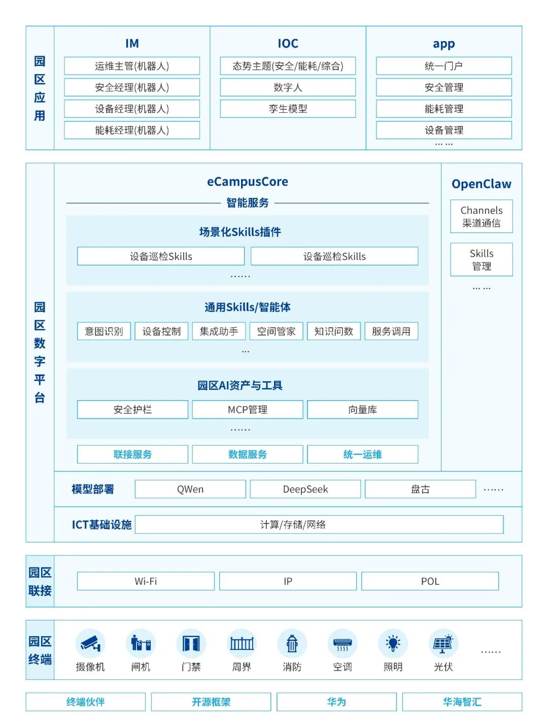3月19日,在华为中国合作伙伴大会期间,华海智汇与华为共同发布智慧园区AI一体机参考架构。作为该架构的首个落地成果,华海智汇推出IOCClaw智联一体机——基于最新OpenClaw技术深度定制,为园区管理者打造"能洞察、会思考、可执行、有记忆"的数字运营团队。