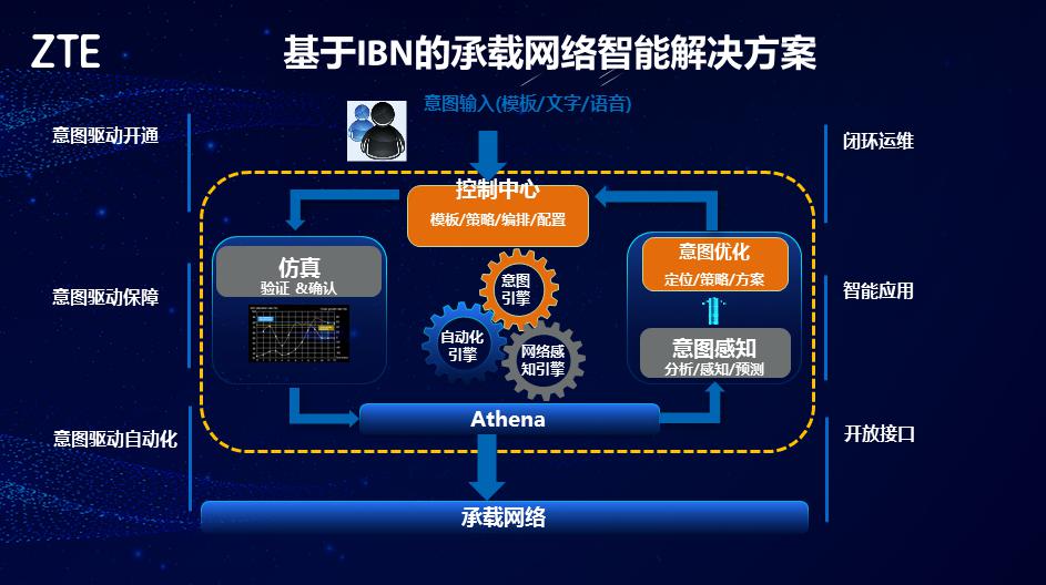中兴通讯承载网络智能化解决方案Athena正是适应智能化网络发展趋势,推出的面向IBN的网络全生命周期智能化解决方案。方案主要由意愿引擎、自动化控制引擎、感知引擎以及AI与大数据分析平台构成,其中前三大引擎协作形成一个智能化闭环。借助三大引擎,用户可以通过语音、文字等多种输入方式表达其意愿,系统与之交互性确认,提升易用性的同时,实现意愿表达的完整性、去模糊性,构建用户与机器之间的桥梁。此外还实现了一致的意愿处理流程,对意愿进行优化修正,进行意愿表达模型的转化,通过自动化的方案设计提前验证等流程保证用户意愿在网络中有效实现。目前基于IBN的智能化解决方案已经具备了网络规划、网络快速构建、业务自动发放、业务自动恢复、故障快速诊断、网络仿真、网络预测、网络优化等智能化服务,并成功与中国移动、中国电信、中国联通、A1等国内外运营商进行商用合作和联合创新,助力运营商提高网络收益,提升网络质量,为5G时代保驾护航。